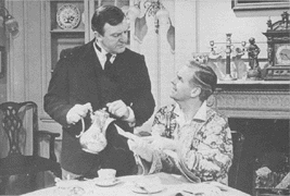 Above L to R - Mr. Armstrong (Robin Bailey); Miss Parton (Caroline Dowdeswell) and Miss Rossiter (Shirley Cain) enjoy tea with Mr. Bredon. |